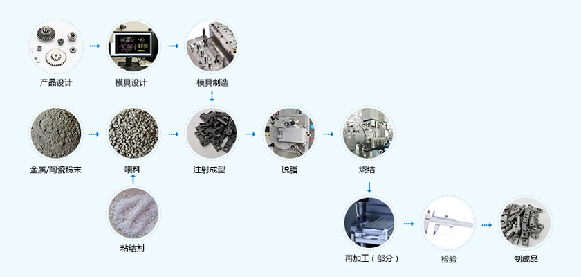 金屬粉末注射成型-將金屬粉末通過與粘合劑混合后利用注塑機通過成型成我們需要的產(chǎn)品。再經(jīng)過脫脂燒結(jié)緩解制成金屬配件,大大地降低了生產(chǎn)成本,提高了生產(chǎn)效率和產(chǎn)品進度。